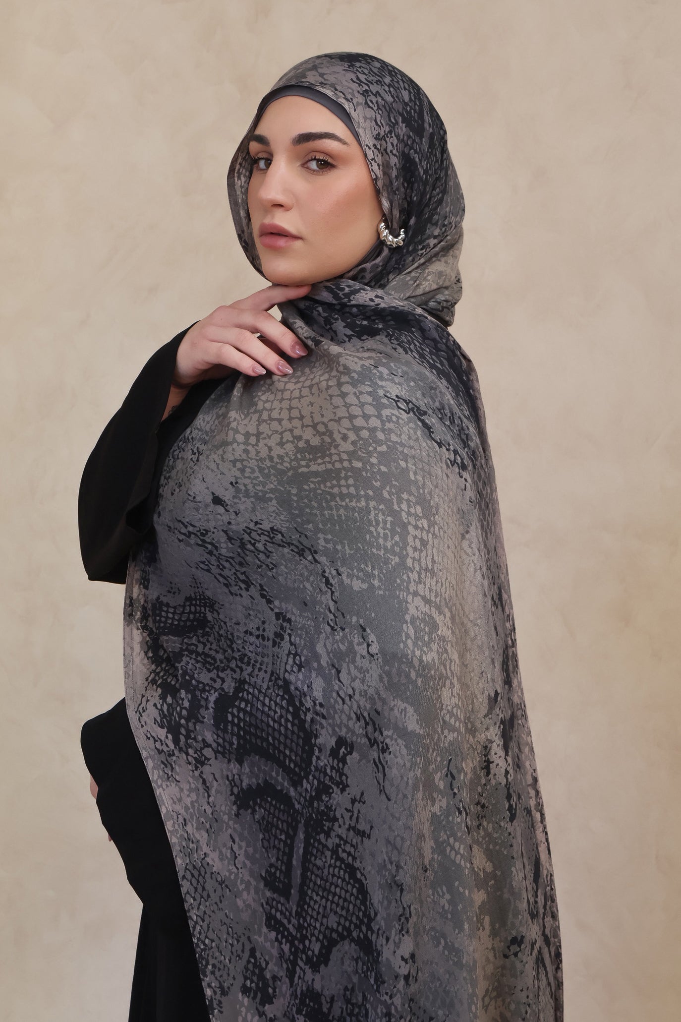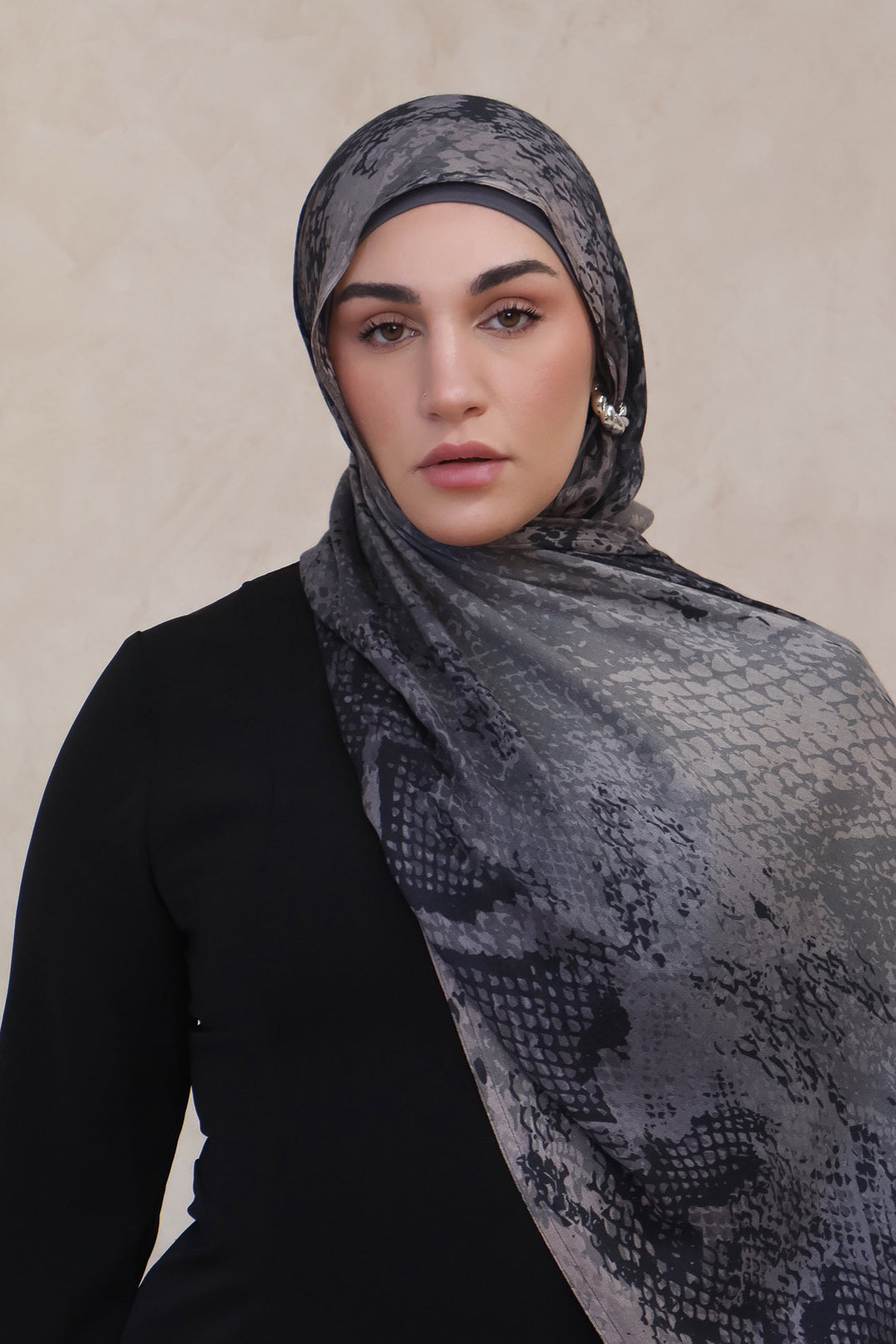 Cobra features a deep, dark snakeskin inspired print that adds a bold and modern touch to any look. Made with our signature modal fabric, this hijab has a beautiful, natural drape and a soft, airy feel making it ideal for daily wear or dressing up for special occasions.