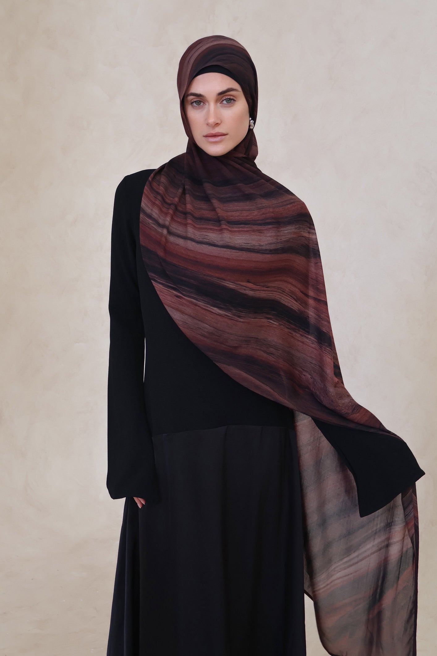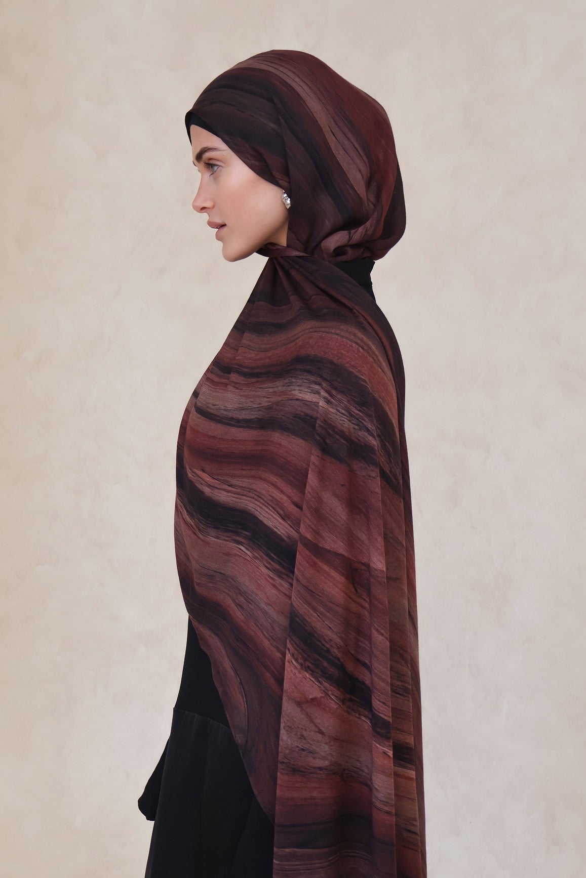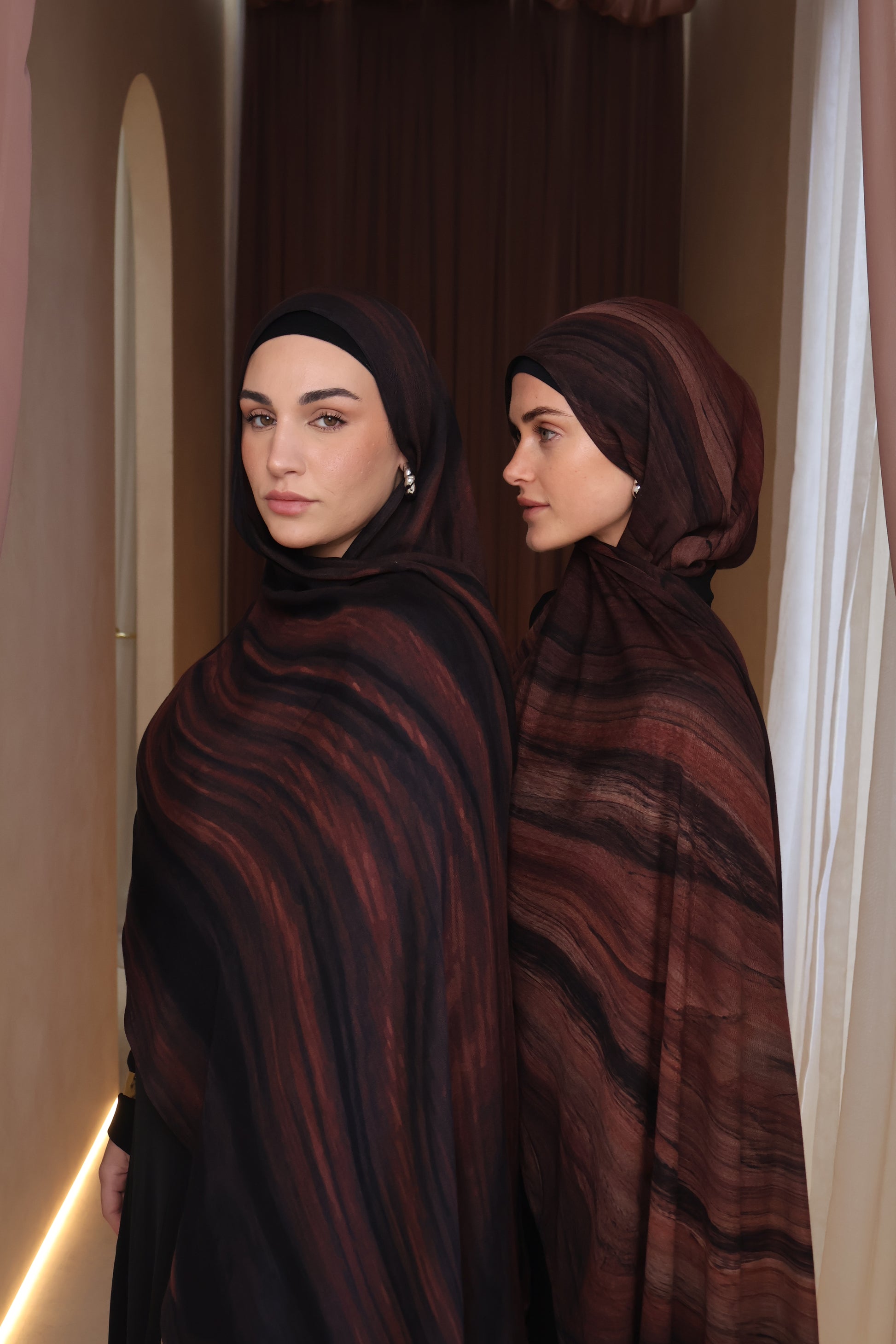 Maple Forest evokes the serene beauty of autumn’s changing leaves where deep chestnut meets burnt maple and soft espresso undertones. The natural wave of colours mimics the graceful flow of tree grains, creating a captivating pattern that feels both bold and organic. Its warm, earthy tones bring depth and refinement to any outfit, making it a timeless addition to your collection. Crafted from our signature modal fabric, it drapes effortlessly with a soft, breathable texture that feels light yet luxurious against the skin. Perfect for elevating your everyday wear or adding a touch of sophistication to an evening look.