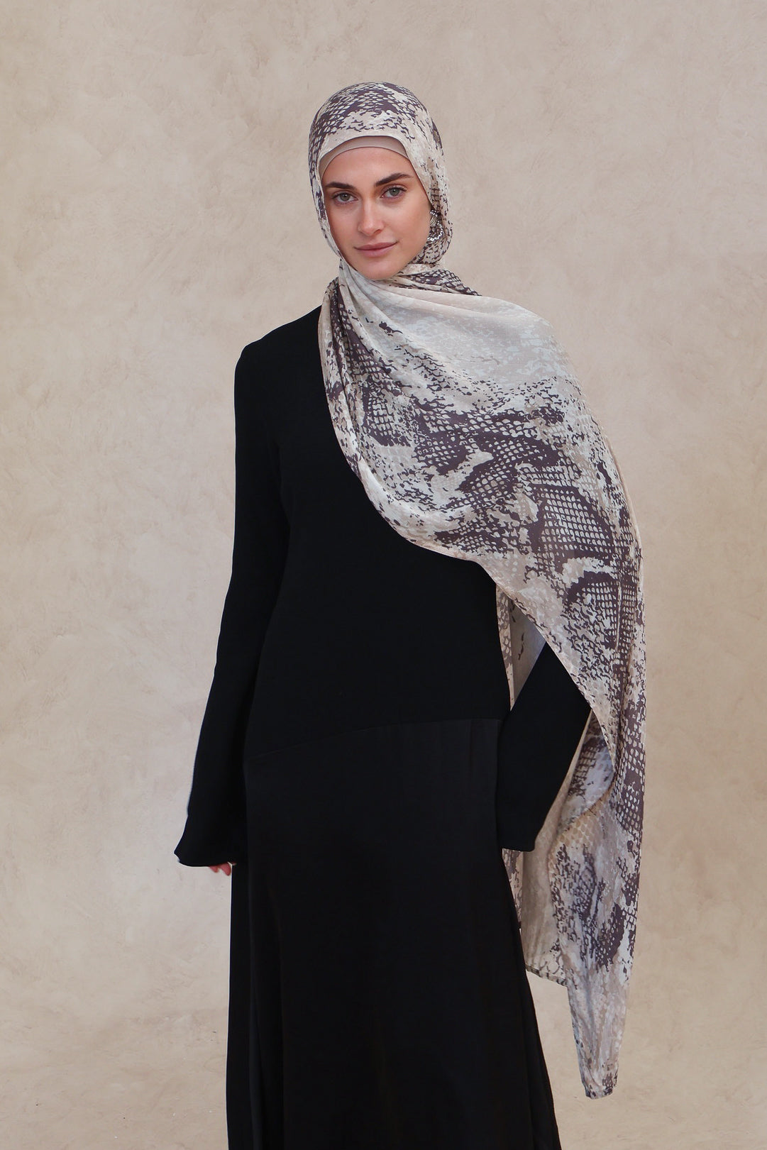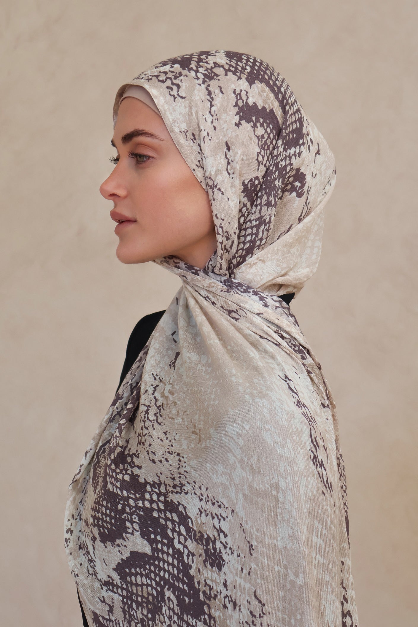 Python hijab is a statement piece designed to elevate your look. Featuring a bold snakeskin inspired print in neutral tones, it blends style and elegance effortlessly. Made with our signature modal fabric, this hijab has a beautiful, natural drape and a soft, airy feel making it ideal for daily wear or dressing up for special occasions.
